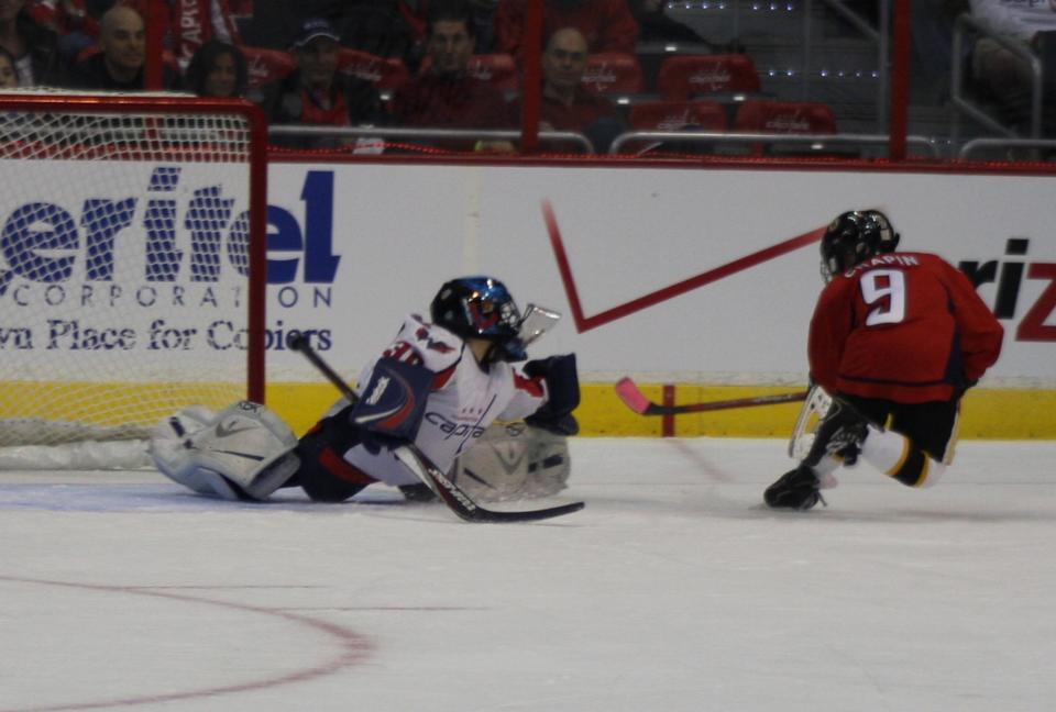 This week he was on that ice again during the second intermission of the lockout-delayed home opener. Another event that the Caps hold is a shootout competition, which pits local goalies from different age groups against shooters through two preliminary rounds, with winners competing in the finals during a Caps game. They play it up as a “battle of the states” with the finalists from Maryland competing against the finalists from Virginia. My son was the VA goalie for one of the two Squirt divisions and thus made his second appearance on the Verizon Center ice.